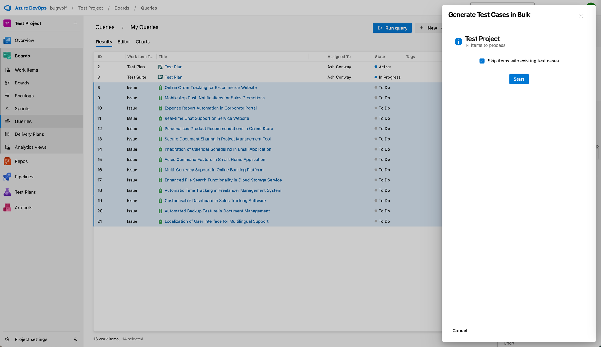 - Choose the Work Items you wish to generate test cases for in bulk and use the Shift key to select multiple items.
