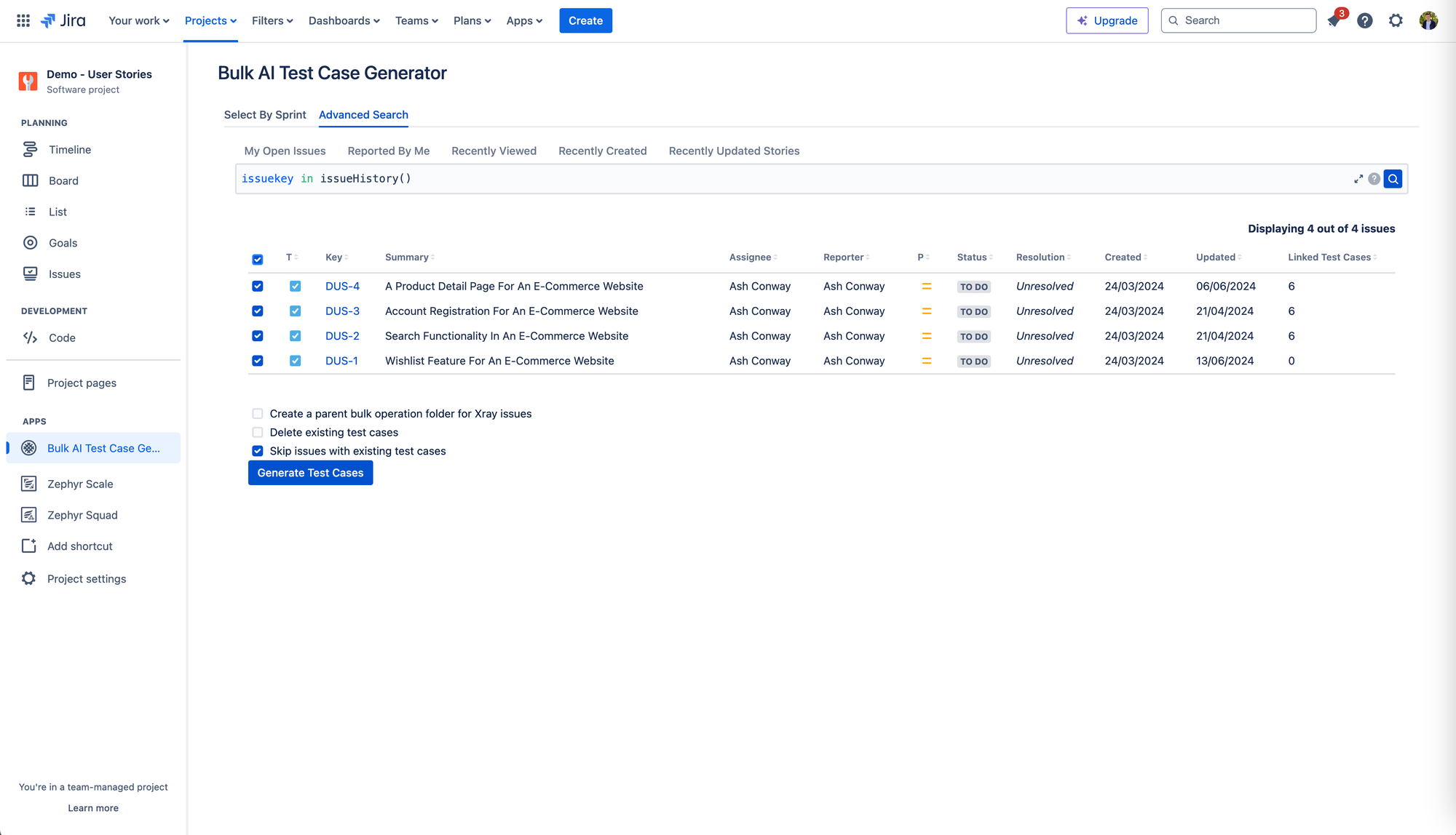 Seamlessly integrate the AI Test Case Generator for Jira with Zephyr, enabling high-volume test case generation and organized test management. Elevate your testing process today!